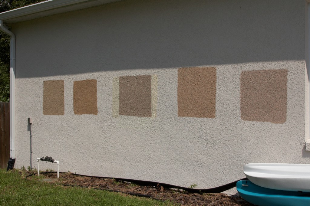 1 We decided to have the house painted in early fall of 2008. We wanted a deeper richer color than the original light pastel peachy cream. The winning color combo was Sherwin Williams 'Trusty Tan' and 'Casa Blanca' for the trim. That's trusty tan in the middle. In retrospect it looks to have more gray in the sample square we painted compared to the actual color when the house was painted.